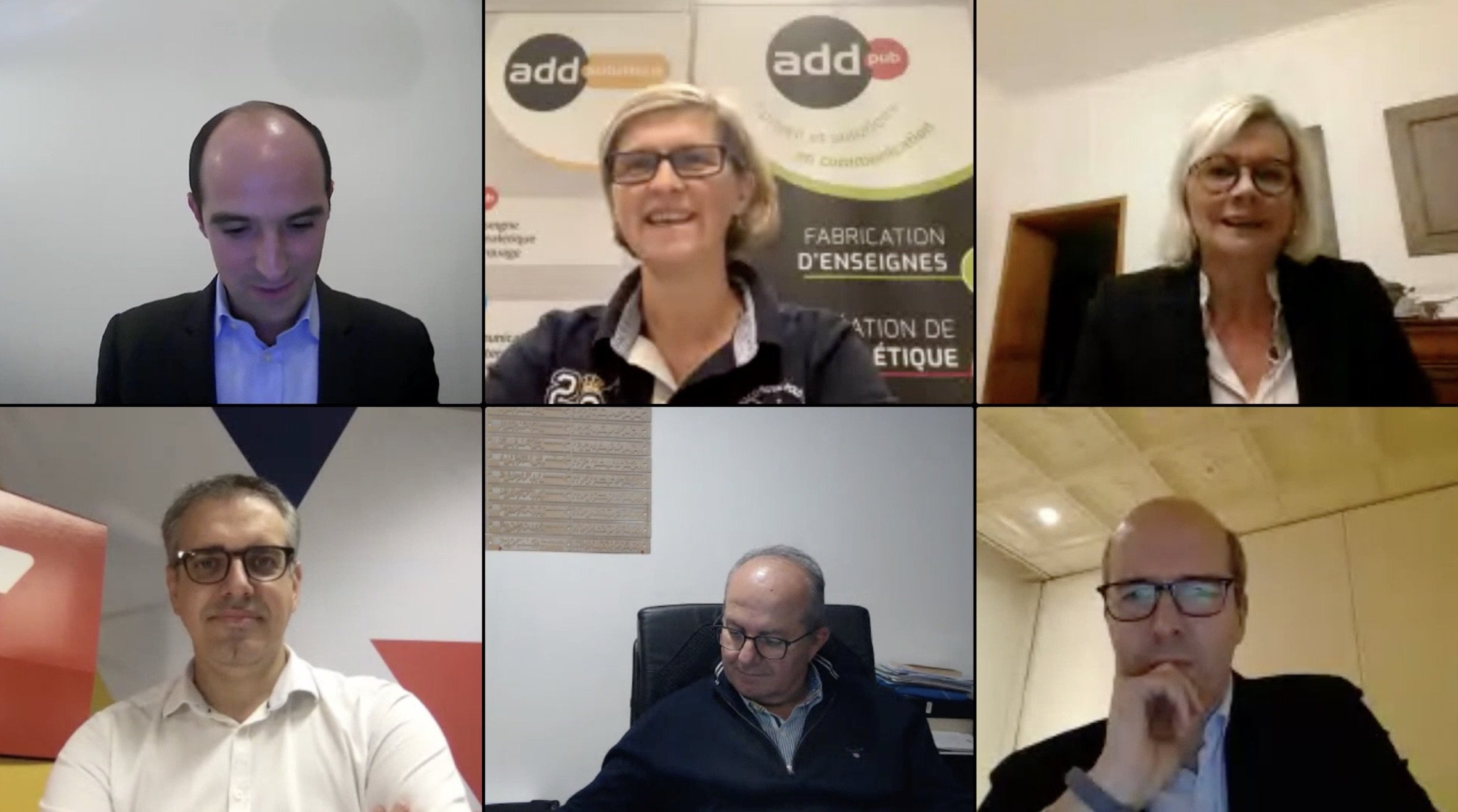 Légende : de gauche à droite, en partant par le haut : Bénédicte Fontaine, gérante d’ADD Pub – Sylvie Gilles, gérante de la Ferme des 4 Cantons – Jacques Staquet, PDG Co-fondateur d’Yper – Olivier Daher, président fondateur d’ANS COM – Olivier Barbet Maillot, PDG d’Abena Frantex
