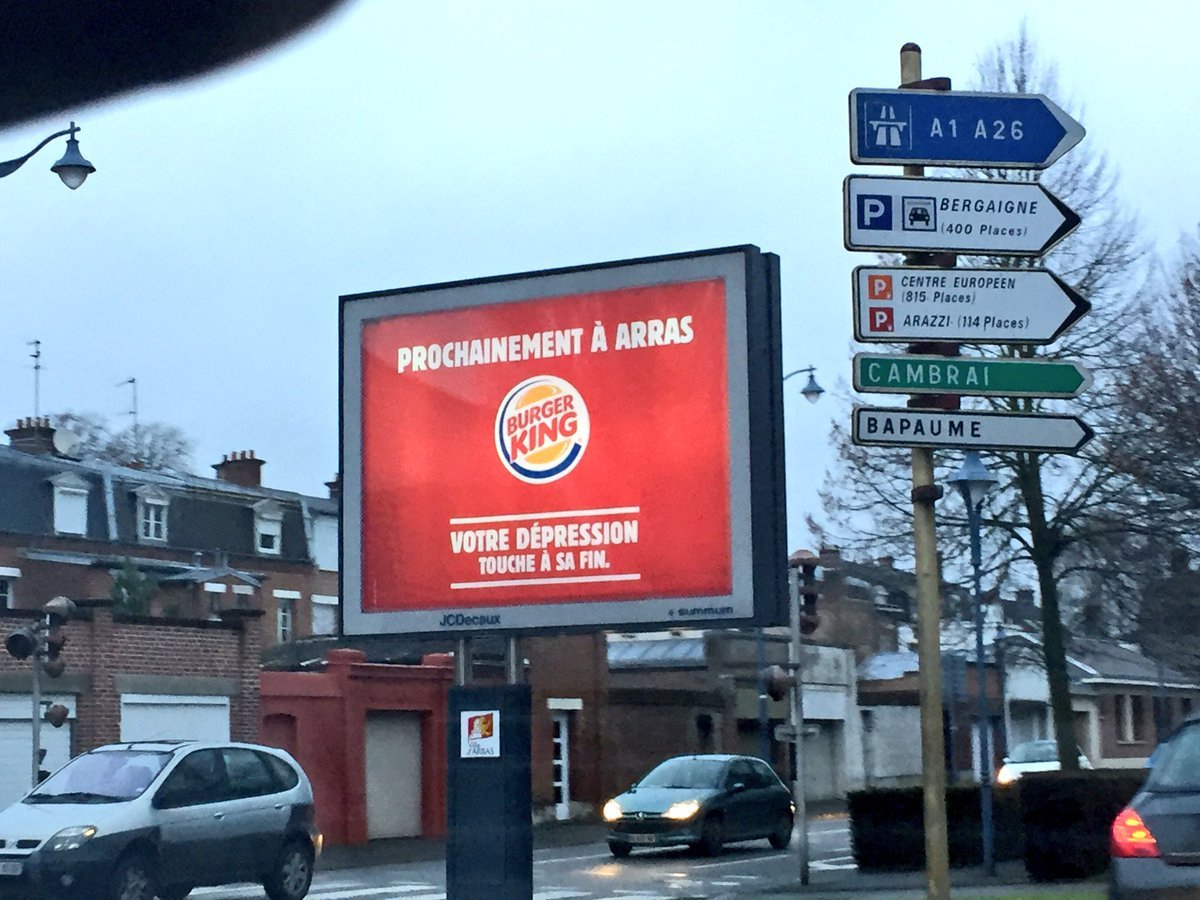 A Arras, le restaurant Le Yummy’s, spécialisé dans les burgers à base de produits frais, n’a pas hésité à utiliser les réseaux sociaux pour répondre à l’arrivée de Burger King, qui avait placardé des affiches publicitaires avec le message « Votre dépression touche à sa fin ».